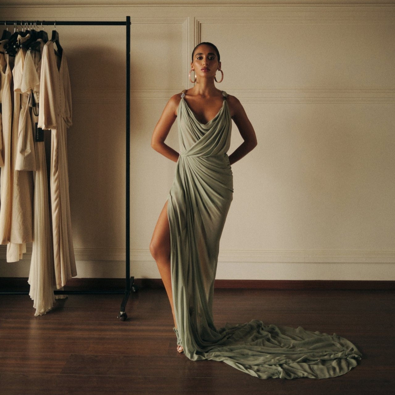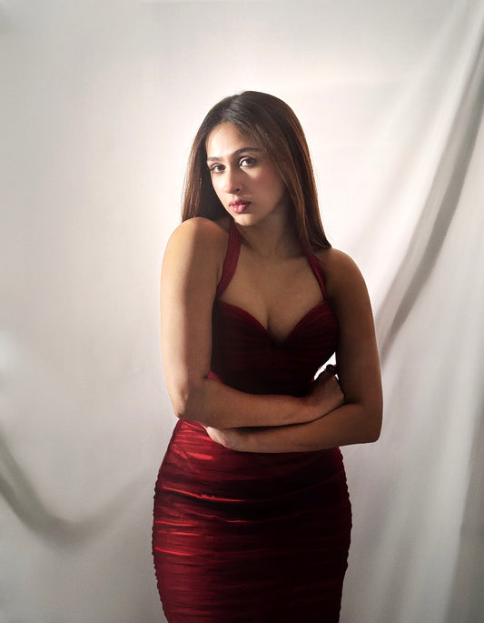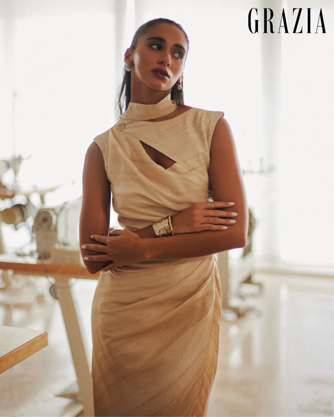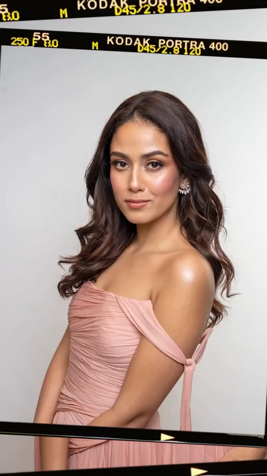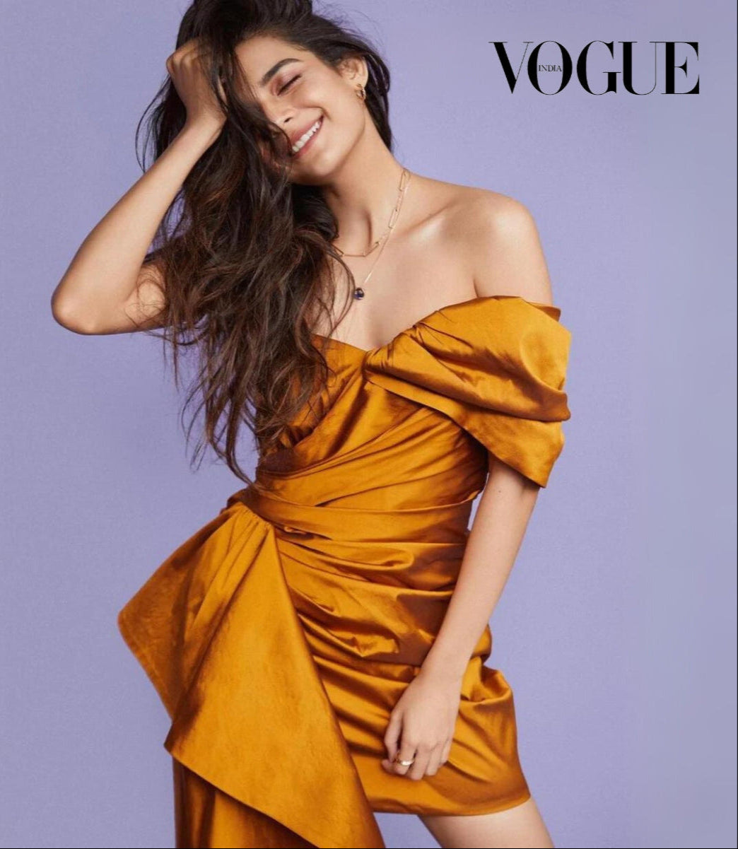 Vogue India showcases classic elegance with our bestseller 'Trail Drape Dress' in Rust, worn by Mithila Palkar.