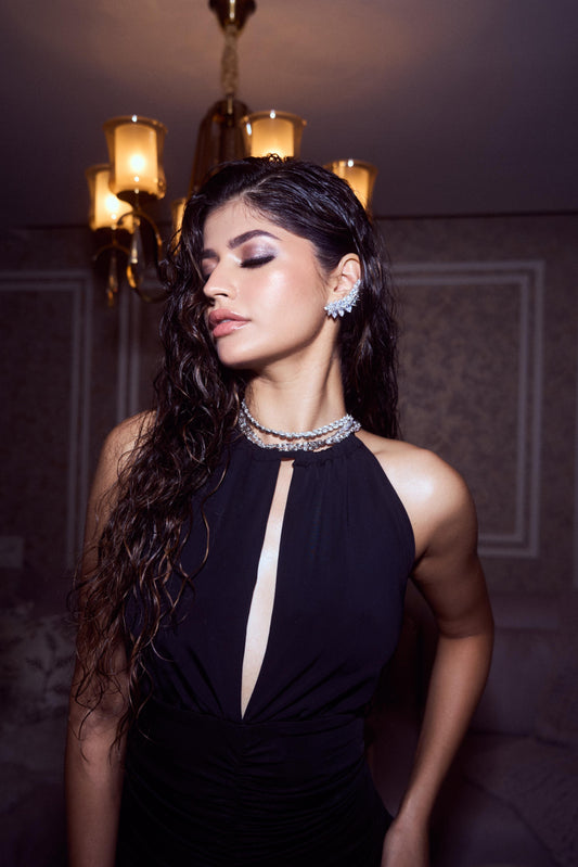 Our Pearl Cluster Dress is a collision of contrasts, where the ethereal glow of hand-strung pearls meet a bold black silhouette, worn by Sharvari.