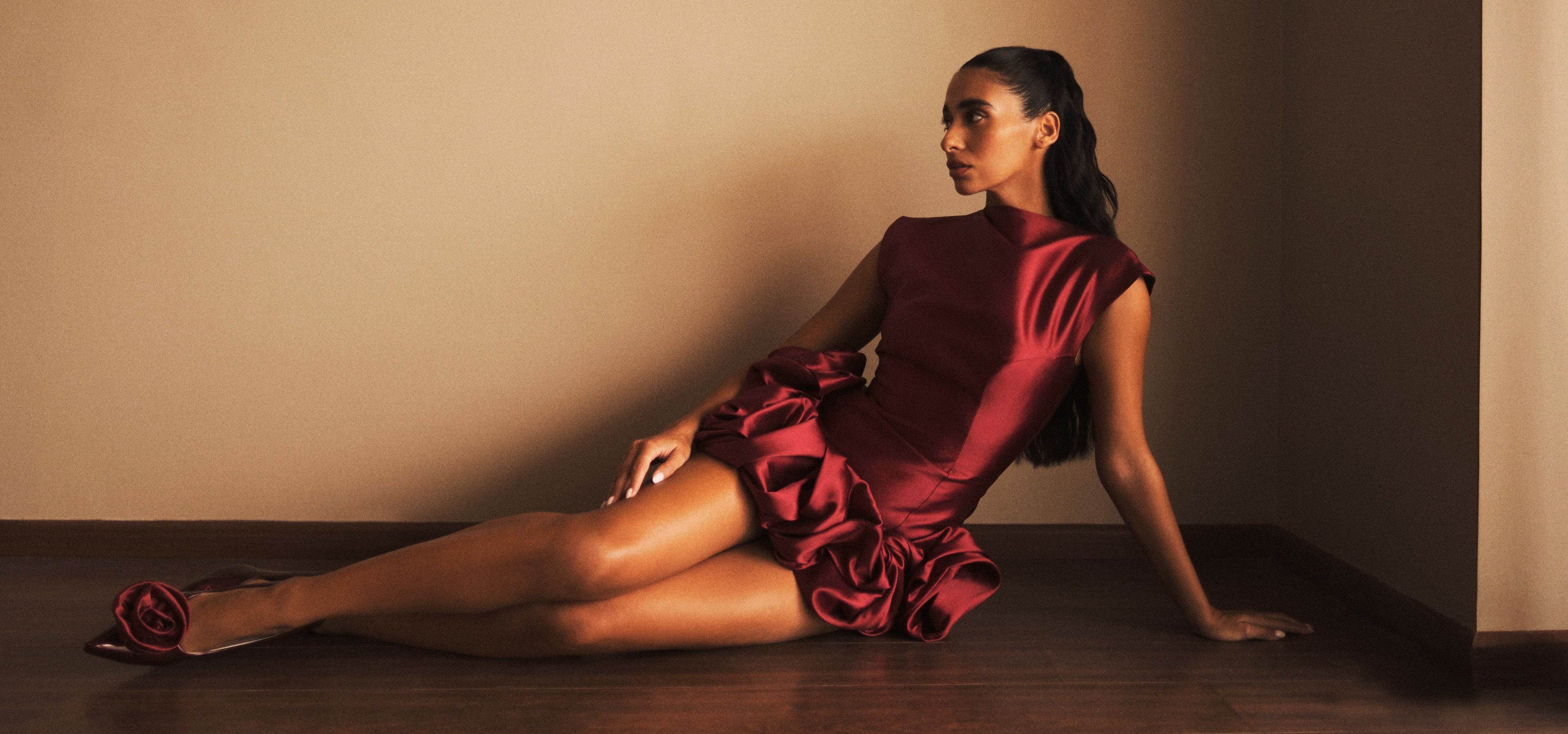 Kiara in our cocktail dress from the Evening Wear Collection, featuring a sultry silhouette and statement cut-outs.