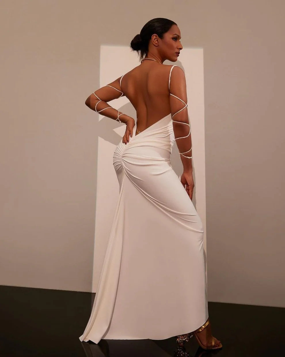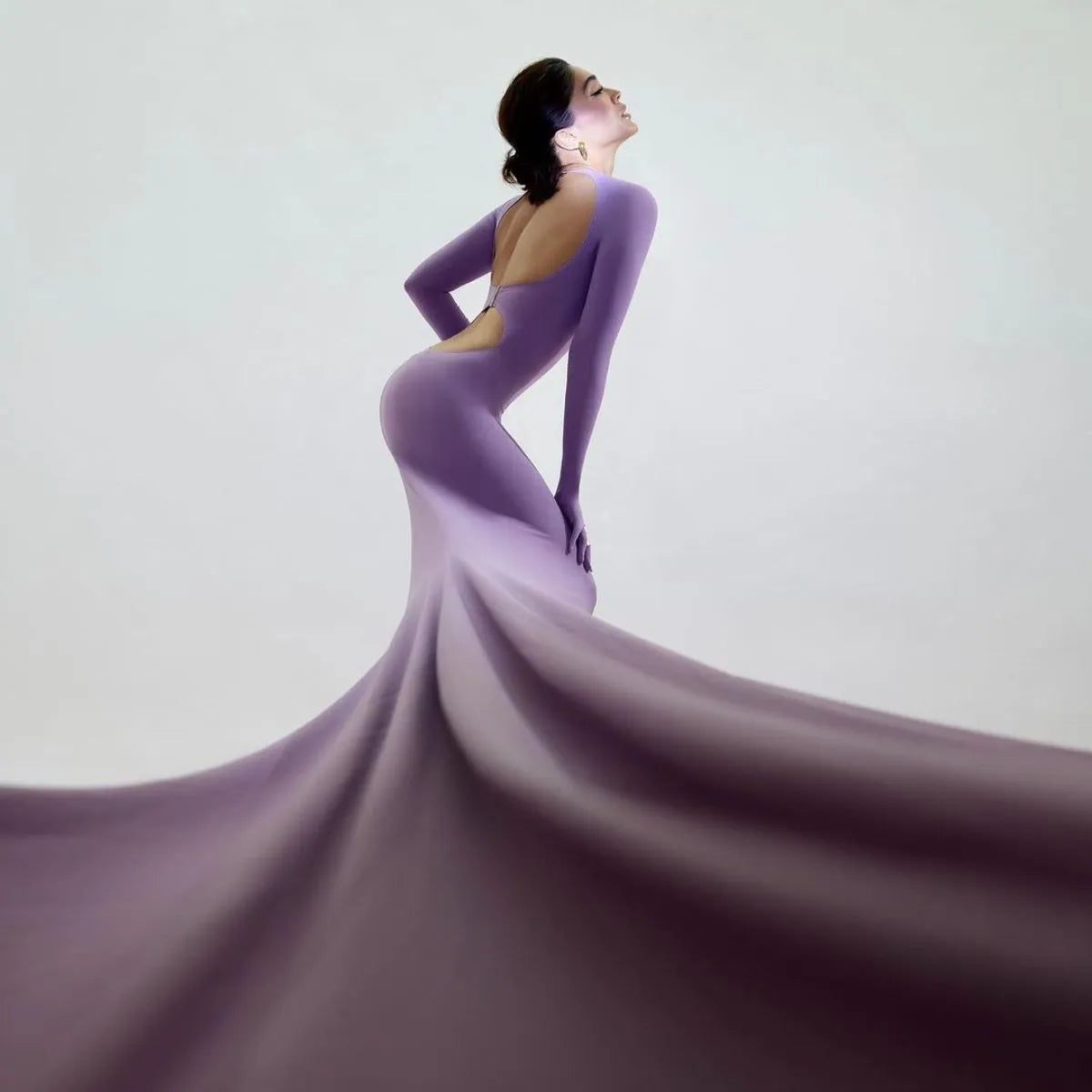 Lavender haze: Where elegance meets edge, trailing with a bodycon silhouette, a statement cut-out back, and gloves! Available on request.