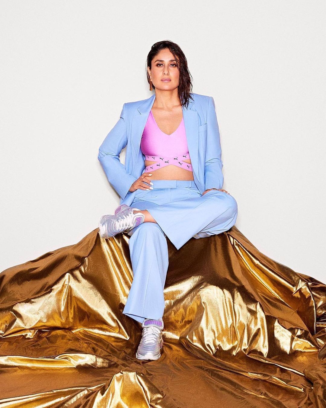 Kareena Kapoor Khan makes a strong case for athleisure in our powder blue tailored pantsuit, created exclusively for the Puma campaign. Designed to blend high fashion finesse with athletic-inspired elegance.